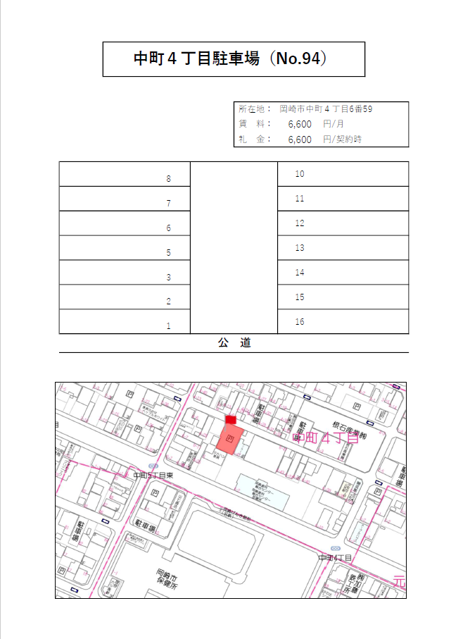 【No. 94 】 中町4丁目駐車場 空き状況 空き有 8 台 所在地 岡崎市中町4丁目6-59 月額駐車料金 6,600 円(税込) 礼金 6,600 円(税込) ※契約時 地面状況 アスファルト 特記事項 駐車場に関するお問い合わせ LINEにて 永昌開発コンサルタントの公式LINEにお友だち追加してお問い合わせください。 メールにて 氏名 ※必須 メールアドレス ※必須 電話番号 連絡希望の時間帯 契約希望時期 契約希望台数 ※必須 お問い合わせ内容 « 百石町駐車場